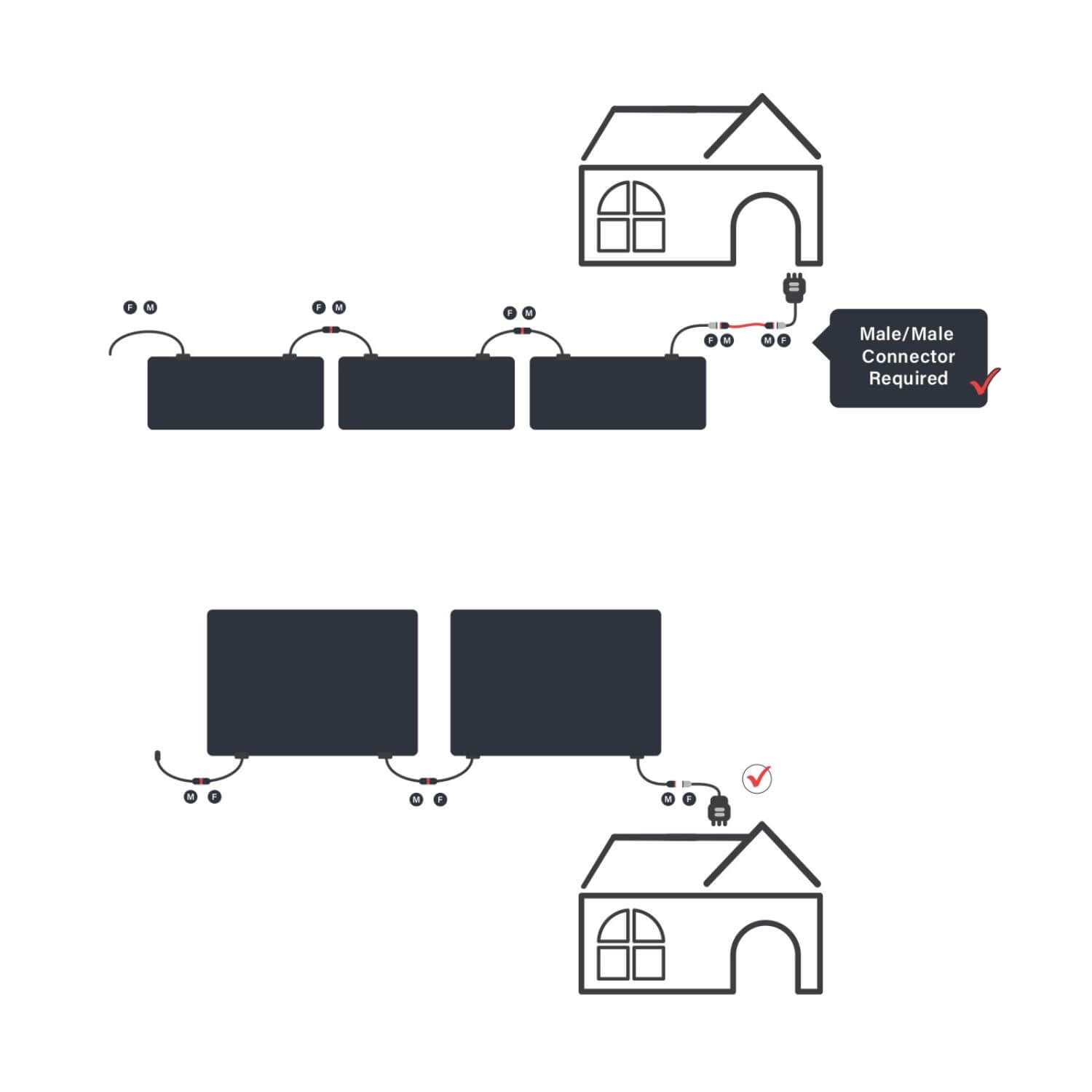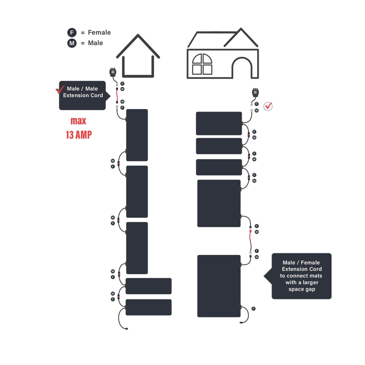 Use the male and female extension cables to safely daisy-chain multiple mats and create a custom heated pathway for your space. Use sample illustrations below: